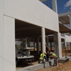 El cerramiento se realiza mediante panel prefabricado de hormigón blanco.