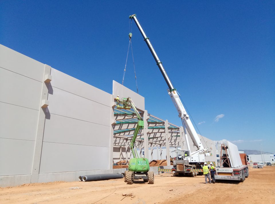 Nave industrial para la fabricación de impresoras industriales en Almazora (Castellón) de 6.880 m² con altura libre de 8,00 m y formada por dos líneas de vigas delta de 22,00 m de longitud. Cerramiento colocado entre los pilares prefabricados.