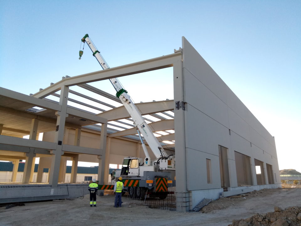Estructura, cerramiento y forjado alveolar para un supermercado de superficie total 3.245 m² en Alcoy (Alicante). Solución mixta (estructura metálica sobre pilares prefabricados de hormigón armado), cerramiento a base de paneles con rotura de puente térmico y placas alveolares para el forjado del parking y tienda del supermercado.